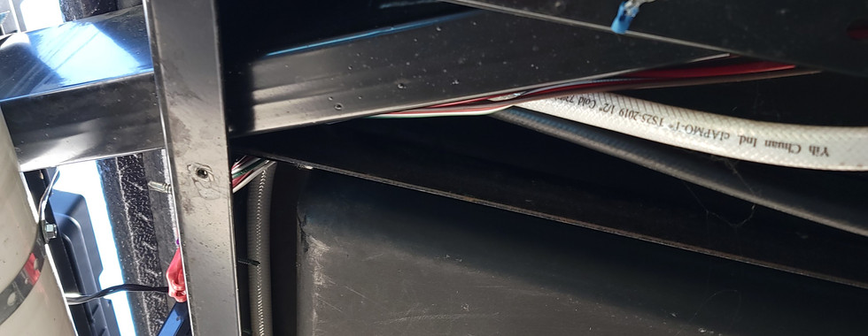 Before you can start the drivers side you have to move the Main Propane line coming from the regulators. To do this remove the screws from the hose straps on the tongue and on the back frame so you can slide it around. Leave it loose until you install the stabilizer (See steps 1-4 above). Once you have the stabilizer on and tight you can use the STS Screws that you removed from the straps to set them in a new spot and redirect the main propane line.